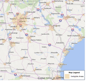 The map below shows the areas of Georgia eligible for a USDA loan. To see if your area qualifies, head over to the USDA property eligibility screen.