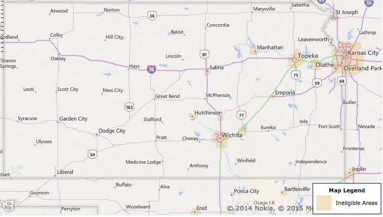 The map below shows the areas of Kansas eligible for USDA loans. For more information on qualifying areas and properties, check out the USDA property eligibility screen.