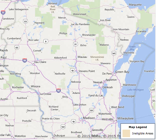 The map below shows the areas of Wisconsin eligible for USDA loans. For more info on qualifying areas, head to the USDA property eligibility screen.
